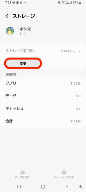 ストレージの詳細画面では、アプリの使用量やストレージの種類が表示されます。ここで、「変更」または「移動」のオプションが表示されているか確認しましょう。